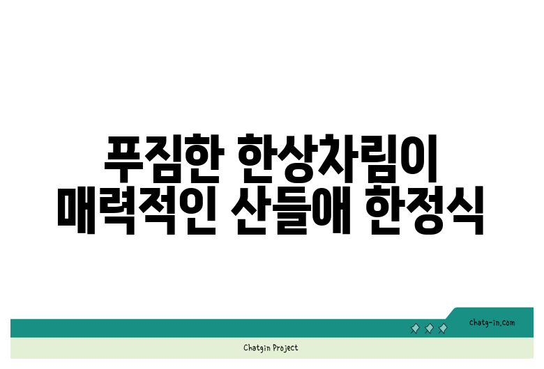 | 산들애 한정식 | 한정식 | 20.000원~ | 푸짐하고 정갈한 한상차림 |